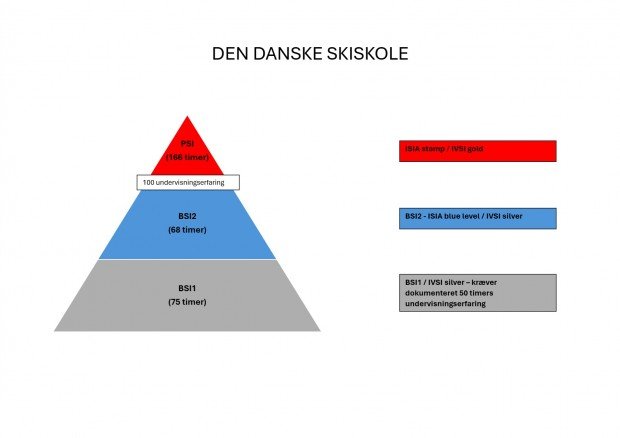 Den danske alpine skiinstruktøruddannelse består at tre niveauer: Basic Ski Instructor 1 (BSI1) og Basic Ski Instructor 2 (BSI2) & Professional Ski Instructor (PSI).